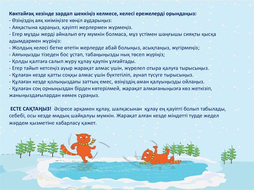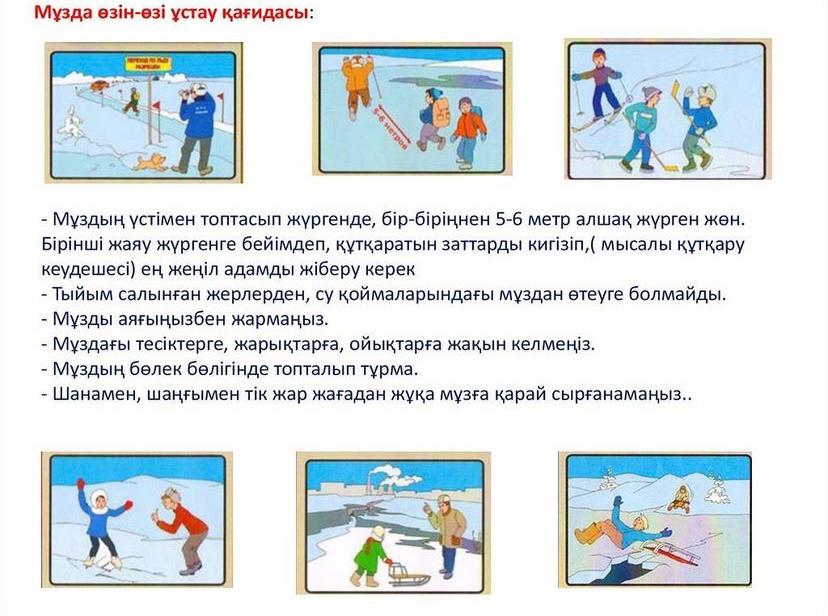 Құрметті ата-аналар! Суық ауа райының басталуымен су айдындары қата бастағанда, апаттар саны күрт артады. Осыған байланысты балаларыңызға көңіл бөліп, нәзік мұзға шығудың қауіптілігін айтып беруіңізді сұраймыз. Балаңыздың бос уақытын қайда өткізетініне қызығушылық танытыңыз. Балалардың күзгі-қысқы кезеңде су айдындарында өтуіне және қалуына жол бермеңіз. Мұз ойындары әсіресе қабылданбайды! ❗❗❗ Құрметті ересектер! Бей-жай қарамаңыз, балалардың мұзға шығу әрекеттерін тоқтатыңыз, абайсыздық қайғылы оқиғаға айналуы мүмкін! Қиындыққа жол бермеу үшін бірнеше қарапайым ережелерді білу және сақтау жеткілікті.