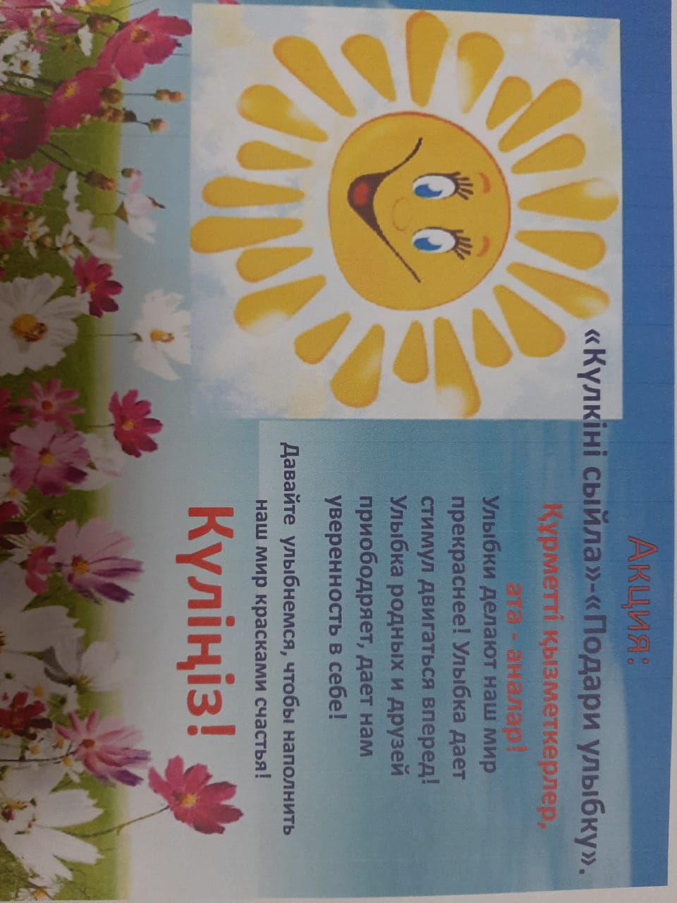 2023 жылдың 13 ақпанында балабақшамызда «Психология апталығы» аясында «Күлкіні сыйла» - «Күлкі сыйла» акциясы өткізілуде, оның мақсаты – жағымды эмоционалды атмосфераны құру. Күлкі біздің әлемді әдемі етеді! Туыстарының, әріптестерінің, достарының күлкісі көңілімізді көтереді, өзімізге сенімділік береді! Әлемімізді бақыт түстерімен толтыру үшін күлейік! Педагог-психолог: Каткенова Е.С.