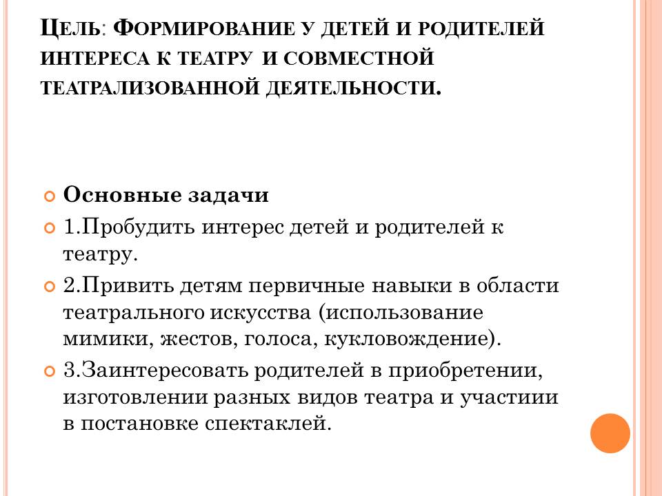 Цель: Формирование у детей и родителей интереса к театру и совместной театрализованной деятельности.