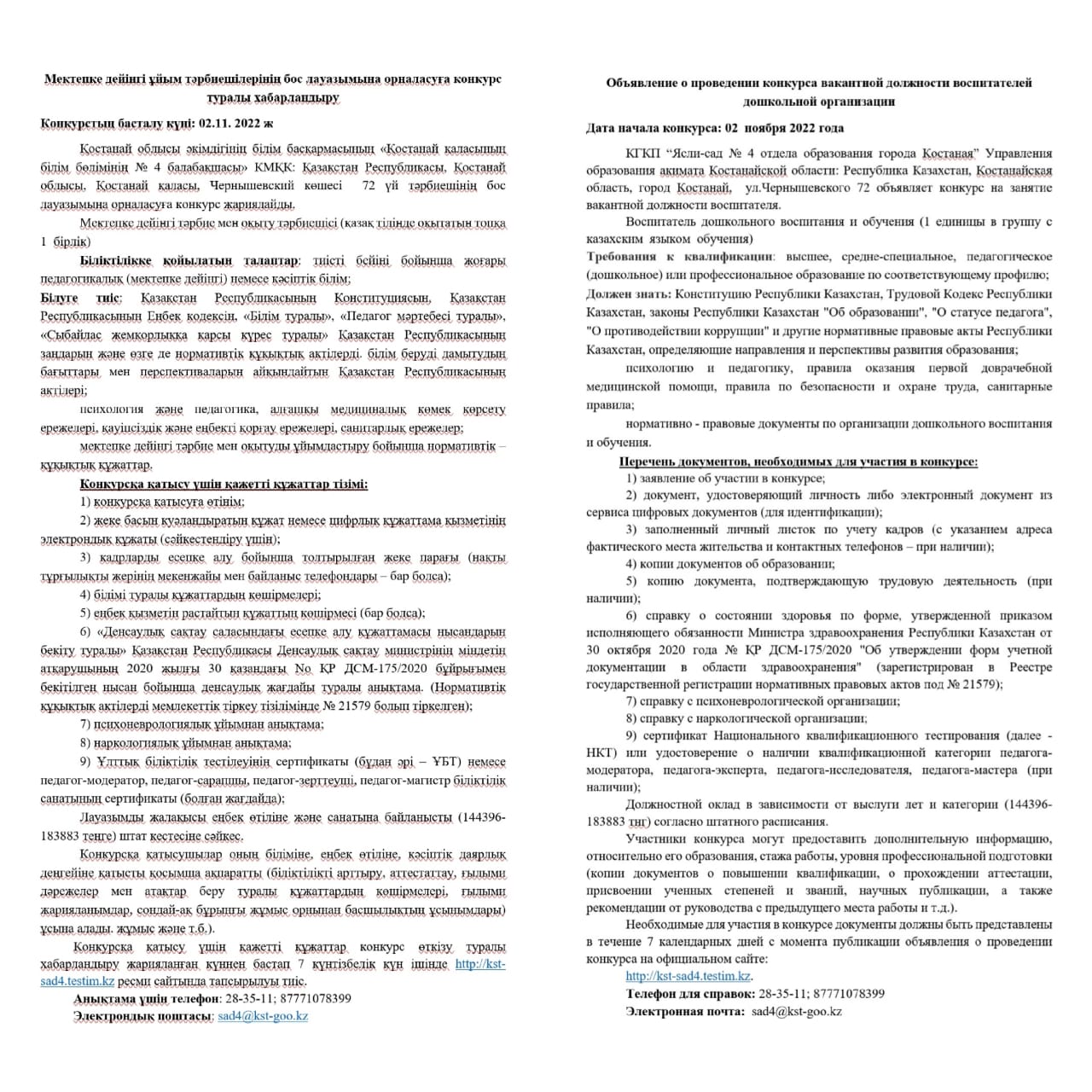 Объявление о проведении конкурса вакантной должности воспитателей дошкольной организации